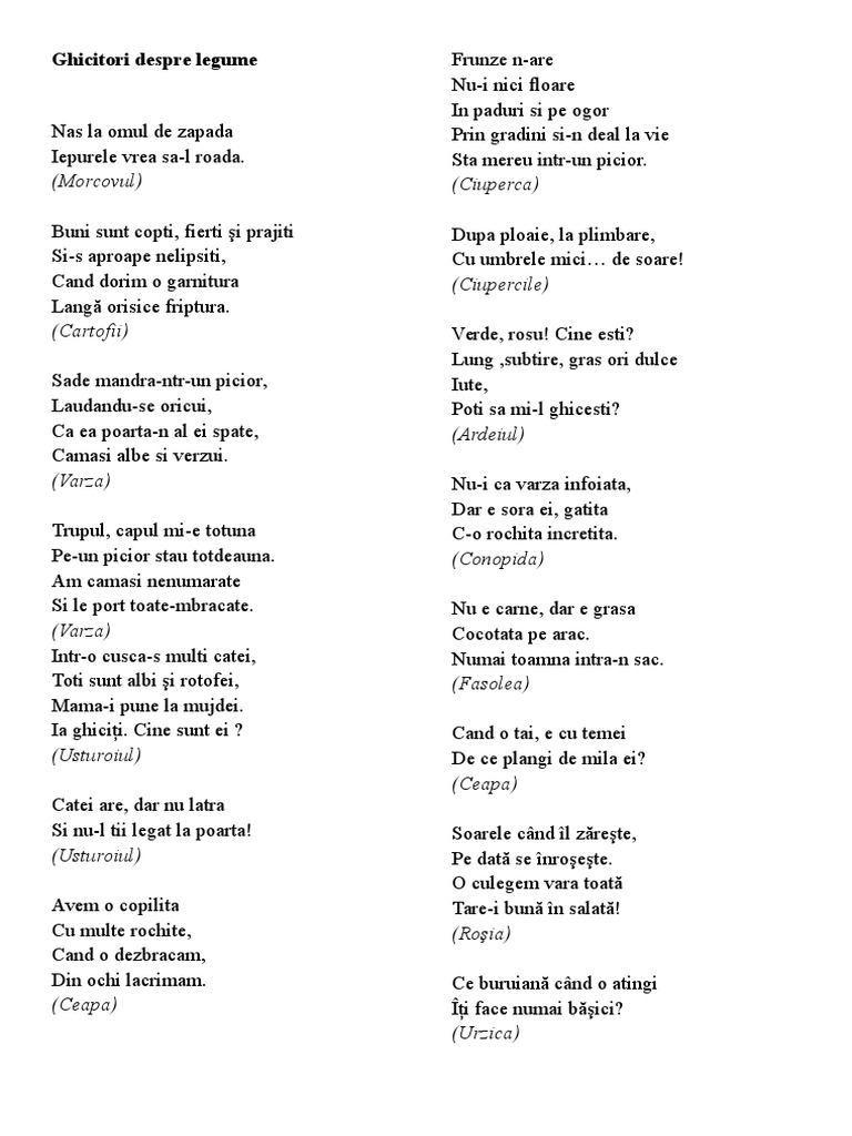 Cantece de primavara versuri cantece 1 iunie versuri. De narcis ne aminteste. Aceasta colectie contine ghicitori despre legume de toamna precum. Când îl guşti te strâmbi tuşeşti şi îndată l şi ghiceşti.