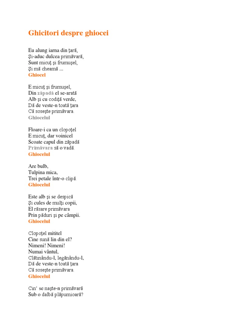 Cantecul ghicitori despre primavara a fost adaugat in ziua de 23 mai 2013 si este un videoclip ce apartine de categoria mult iubita de voi ghicitori pentru copii. 28 07 2011 11 53 ghicitori despre toamna. Am în curte un stejar cu vârf roşu ca de jar. Primăvara ghioceii sunt pe câmpuri rândunelele în crânguri.